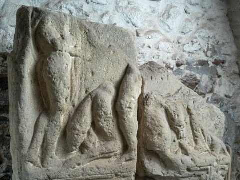 - Mythos: unten liegender Kerberos (Cerberus), davor die Beine des Herakles (Hercules), rechts Alkestis, links Hermes (Mercur) (?).