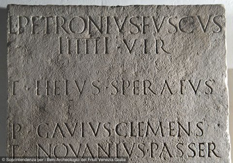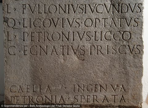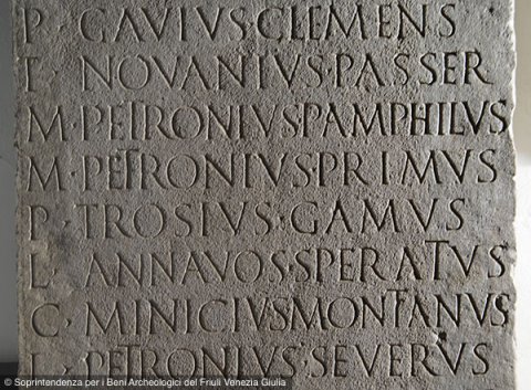 - L(ucius) Petronius Fuscus / IIIIIIvir / / T(itus) Heius Speratus / / P(ublius) Gavius Clemens / T(itus) Novanius Passer / M(arcus) Petronius Pamphilus / M(arcus) Petronius Primus / P(ublius) Trosius Gamus / L(ucius) Annavos Speratus / C(aius) Minicius Montanus / L(ucius) Petronius Severus / L(ucius) Petronius Doctus / Q(uintus) Albius Pudens / L(ucius) Fullonius Iucundus / Q(uintus) Licovius Optatus / L(ucius) Petronius Licco / C(aius) Egnatius Priscus / / Caelia Ingenua / Petronia Sperata / / loc(us) mon(umenti) in fr(onte) p(edes) X in ag(ro) p(edes) [---]