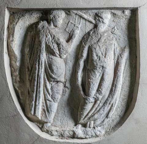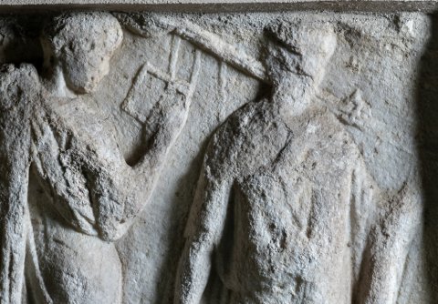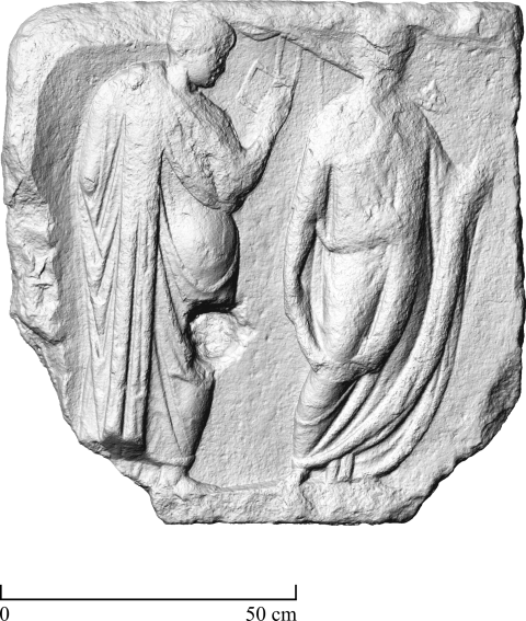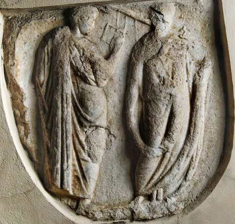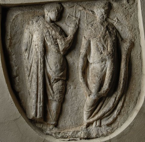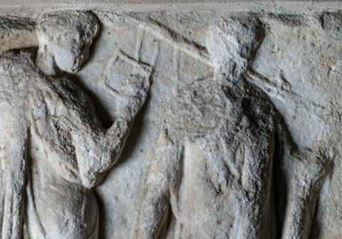 - links Togatus mit Schreibtafel (Scriba), rechts Togatus (Lictor) mit Rutenbündel (fasces) mit kleinem Beil und Bändern. Teil eines sella curulis-Reliefs ?