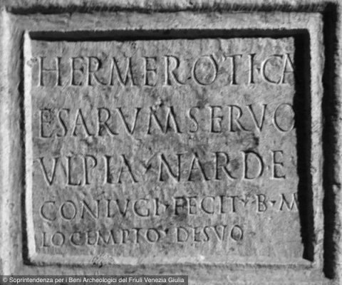 - Hermeroti / Caesarum servo / Ulpia Narde / coniugi fecit b(ene) m(erenti) / loc(o) empto de suo // l(ocus) m(onumenti) in f(ronte) p(edes) VIII (!) a(gro) p(edes) / XV
