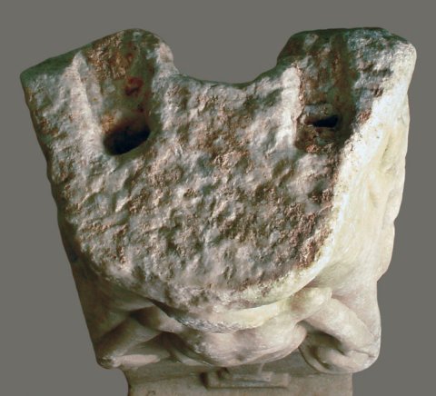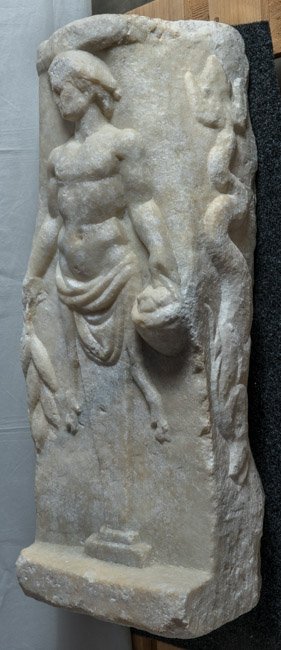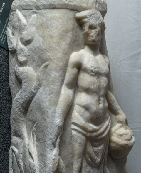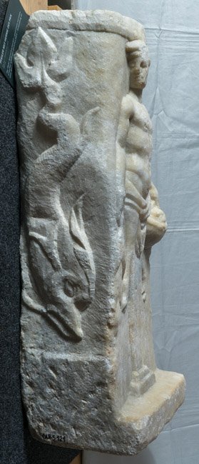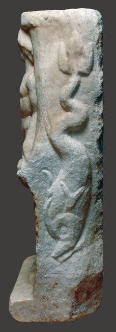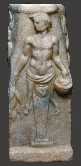 - Auf den Vorderseiten je eine Paniskos-Herme mit Tierfell um die Hüften, in der Rechten Zweig, in der Linken Korb mit Früchten. Auf den Nebenseiten Delphin.