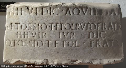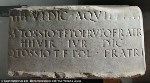 - [- Tossius T(iti) f(ilius) Pol(lia tribu) ---] / IIIIv(iro) i(ure) dic(undo) Aquil[eiae] / M(arco) Tossio T(iti) f(ilio) Pol(lia) Rufo fratr[i] / IIIIvir(o) iur(e) dic(undo) / Q(uinto) Tossio T(iti) f(ilio) Pol(lia tribu) fratri