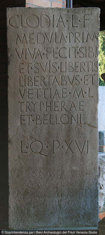 - Clodia L(uci) l(iberta) / Medula Prima / viva fecit sibi / et suis libertis / libertabus et / Vettiae M(arci) l(ibertae) / Trypherae / et Belloni / l(ocus) q(uadratus) p(edum) XVI
