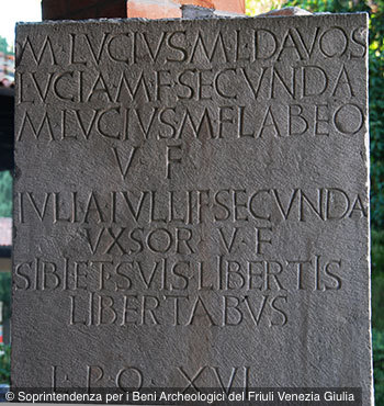 - M(arcus) Lucius M(arci) l(ibertus) Davos / Lucia M(arci) f(ilia) Secunda / M(arcus) Lucius M(arci) f(ilius) Labeo / v(ivi) f(ecerunt) / Iulia Iulli f(ilia) Secunda / uxsor(!) v(iva) f(ecit) / sibi et suis libertis / libertabus / l(ocus) p(edum) q(uadratorum) XVI
