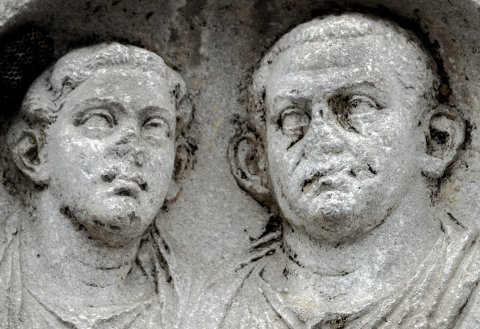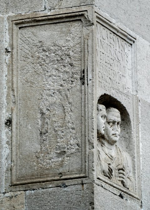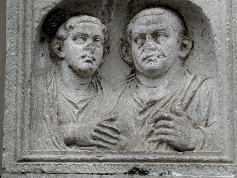 - Gerahmte Vorderseite eines Grabaltars: Oben Inschrift, darunter eingetiefte Bogennische mit zwei Brustbildern (Ehepaar). Frau in Tunica und Mantel, bartloser Mann in der Toga. Auf der linken Nebenseite Umriss eines geflügelten Genius.