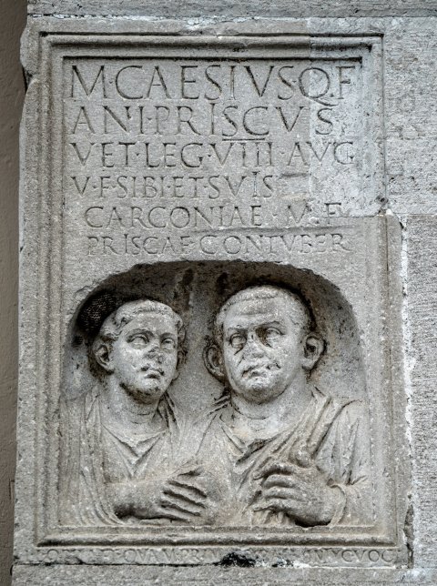 - M(arcus) Caesius Q(uinti) f(ilius) / Ani(ensi) Priscus / vet(eranus) leg(ionis) VIII Aug(ustae) / v(ivus) f(ecit) sibi et suis / Carconiae M(arci) f(iliae) / Priscae contuber(nali) // l(ibertis) l(ibertabus)q(ue) praet(er)quam Prim(us) Tyrann(us) Sintyc(hus) voc(antur)