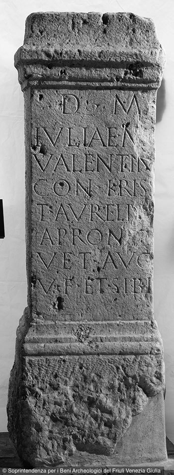 - D(is) M(anibus) / Iuliae M(arci) [-] / Valentin[ae] / con(iugi) k<a>ris(simae) / T(itus) Aureli[us] / Aproni(anus?) / vet(eranus) Aug(usti) / v(ivus) f(ecit) et sib(i)