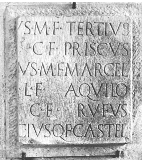 - ---s Q(uinti) f(ilius) Cato] / [---]us M(arci) f(ilius) Tertius / [---]s C(ai) f(ilius) Priscus / [---]us M(arci) f(ilius) Marcel() / [---] L(uci) f(ilius) Aquilo / [---] C(ai) f(ilius) Rufus / [---]cius Q(uinti) f(ilius) Castel() / [---