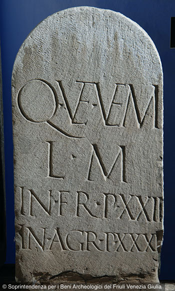 - Q(uinti) Vet(ti) Ve(he)m(entis) / l(ocus) m(onumenti) / in fr(onte) p(edes) XXII / in agr(o) p(edes) XXXI[I]