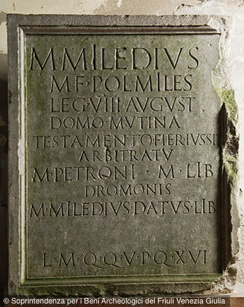 - M(arcus) Miledius / M(arci) f(ilius) Pol(lia) miles / leg(ionis) VIII August(ae) / domo Mutina / testamento fier(i) iussit / arbitratu / M(arci) Petroni M(arci) lib(erti) / Dromonis / M(arcus) Miledius Datus lib(ertus) / l(ocus) m(onumenti) q(uo)q(uo)v(ersus) p(edes) q(uadratos) XVI