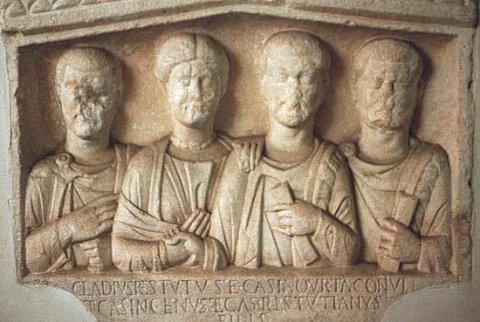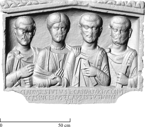 - In Giebelnische vier Brustbilder einer Familie. Von links: Mann: bärtig, Ärmeltunica, Sagum, Scheibenfibel. Frau: Mittelscheitel, Tunica, Mantel, Halskette, Armreifen. Mann: bärtig, Ärmeltunica, Sagum mit Fransen, in der Linken Rolle, Fingerring. Mann: bärtig, Ärmeltunica, Sagum mit Fransen, Scheibenfibel, in der Linken Rolle (volumen).