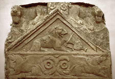 - Als Bekrönung Kubus mit zwei Rosetten zwischen liegenden Löwen mit Widderköpfen in den Pranken. Im Giebelfeld liegender Löwe mit Krater. Im Zwischenfries mythische Figur (Spiralranken zwischen Greifen). Schriftfeld zwischen Säulen mit Spiralkanneluren. Im Sockelbild Mythos (Lupa Capitolina).