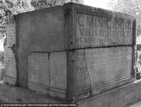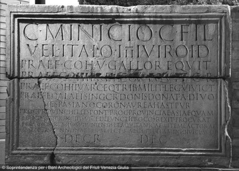 C(aio) Minicio C(ai) f(ilio) / Vel(ina) Italo IIIIviro i(ure) d(icundo) / praef(ecto) coh(ortis) V Gallor(um) equit(atae) / praef(ecto) coh(ortis) Breucor(um) equit(atae) c(ivium) R(omanorum) / praefecto coh(ortis) II Varc(ianorum) eq(uitatae) trib(uno) milit(um) leg(ionis) VI Vict(ricis) / praefecto eq(uitum) alae I sing(ularium) c(ivium) R(omanorum) donis donat(o) a divo / Vespasiano coron(a) aurea hast(a) pur(a) / proc(uratori) provinc(iae) Hellespont(i) proc(uratori) provinciae Asiae quam / mandatu principis vice defuncti proco(n)s(ulis) rexit procurat(ori) / provinciarum Lugduniensis(!) et Aquitanicae(!) item Lactorae / praefecto annonae praefecto Aegypti flamini divi Claudi / dec(reto) dec(urionum) //