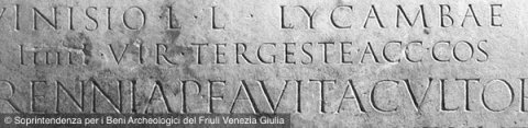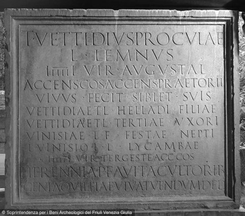 - T(itus) Vettidius Proculae / l(ibertus) Lemnus / IIIIIIvir Augustal(is) / accens(us) co(n)s(ularis) accens(us) praetor(ius) II / vivus fecit sibi et suis / Vettidiae T(iti) l(ibertae) Helladi filiae / Vettidiae T(iti) l(ibertae) Tertiae uxori / Vinisiae L(uci) f(iliae) Festiae nepti / L(ucio) Vinisio L(uci) l(iberto) Lycambae / IIIIIIvir(o) Tergeste acc(enso) co(n)s(ulari) // Herennia P(ubli) f(ilia) Avita cultorib(us) / Geni(i) Aquileiae viva tuendum ded(it) // Herennia / P(ubli) fil(ia) Avita / cultoribus / Geni(i) Aquileiae / [[------]] / [[------]] / viva tuendum dedit