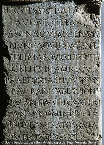 - Hic situs est iusti iu[dex] / laudator et aeq[ui] / Sassina quem genuit / nunc Aquileia tenet / septimae qui cohortis / centuriam reguit / praetoriae fidus non / barbaricae legion[is] / C(aius) Manlius hic Valeri/anus nomine dictu[s] / Sentilius fratri quia / meritus posuit