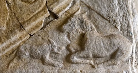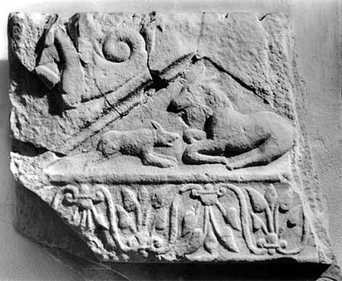 Eingeschriebener Giebel mit Tieren (liegende Ziege, Hund), auf den Schrägen Ranken.