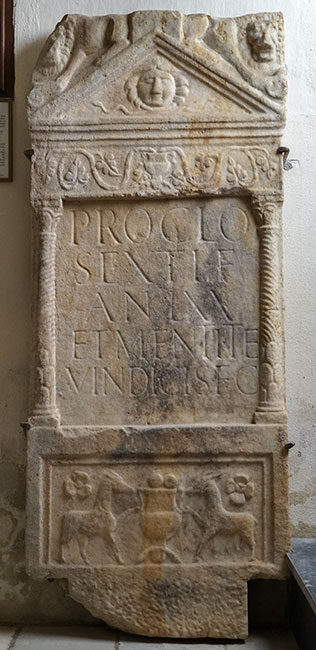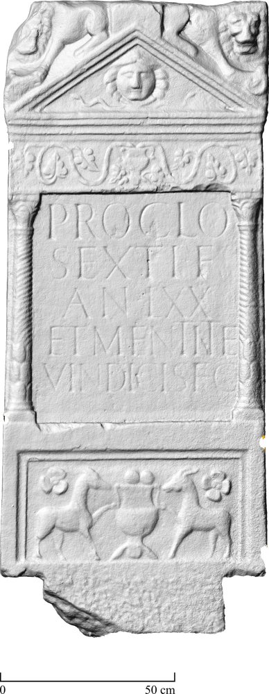 - Proclo / Sexti f(ilio) / an(norum) LXX / et Mentit(a)e / Vindicis f(iliae) c(oniugi)