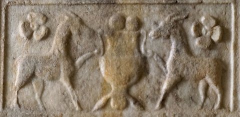 Im Sockelbild Tiere: Krater mit Früchten zwischen Ziegen, Rosetten. - Inschrift