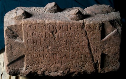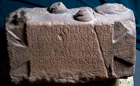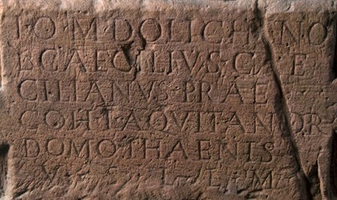 - I(ovi) O(ptimo) M(aximo) Dolicheno / L(ucius) Caecilius Cae/cilianus praef(ectus) / coh(ortis) I Aquitanor(um) / domo Thaenis / v(otum) s(olvit) l(ibens) l(aetus) m(erito)