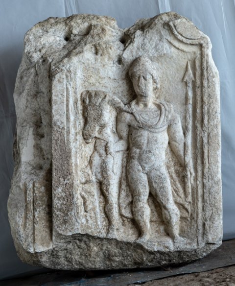 Mythische Figuren: in den bogenförmig gerahmten Seitenfeldern der Inschrift Dioskur mit Pferd.