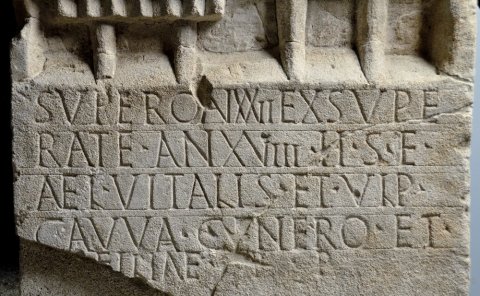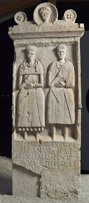 - Supero an(norum) XXII Exsupe/rat(a)e an(norum) XVIII h(ic) s(itus) e(st) / Ael(ius) Vitalis et Ulp(ia) / Cavva genero et / filiae p(arentes) p(osuerunt)