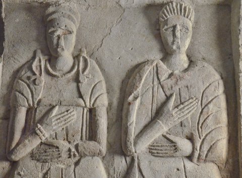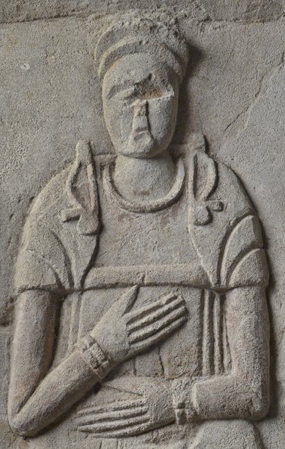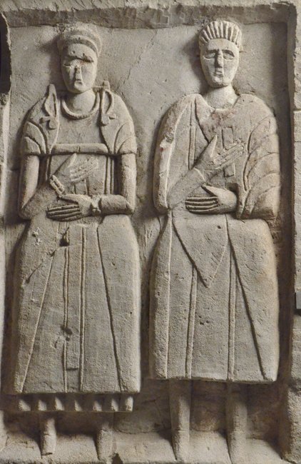 Im Hauptbild stehende zwei Ganzfiguren (Ehepaar). Links einheimische Frau mit Umhang, Ober- und Untergewand, Haube, Fibeln, Halsreif, rechts bartloser Mann in halblangem Gewand und Mantel. - Inschrift