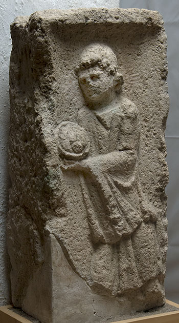 - Eckblock. Auf dem Rest der Vorderseite des Blockes nur geringe Reliefreste. Auf der rechten Schmalseite Diener in kurzer Tunica, in den Händen Schale mit Früchten.