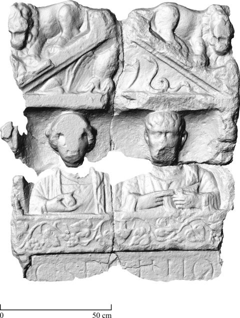 Im Giebelfeld Adler und Schlange, im linken Eck Efeublatt. Im Hauptbild zwischen Säulen zwei Brustbilder (Ehepaar). Links einheimische Frau: Haube, Unter- und Obergewand, Umhang, in der Rechten Frucht. Rechts Mann: bärtig, Locken, Ärmeltunica, Toga, in der Linken Rolle (volumen). Im Zwischenfries Gefäß (Amphore ?) mit Weinranken. - Inschrift