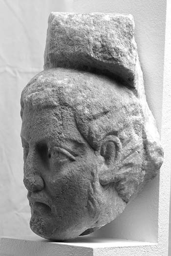 - Porträtköpfe von zwei Männern, einer bartlos, der andere mit Schurrbart und langen Koteletten. Teile einer Porträtnische.