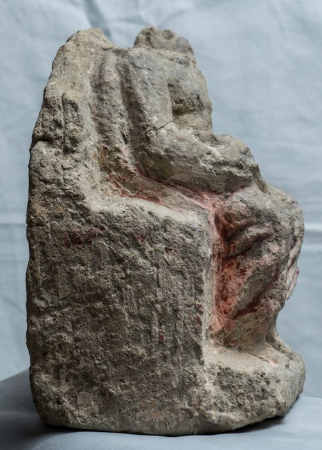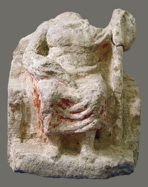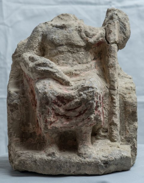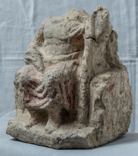 - verwittert, Farbspuren, Kopf fehlt, Szepter abgebr.