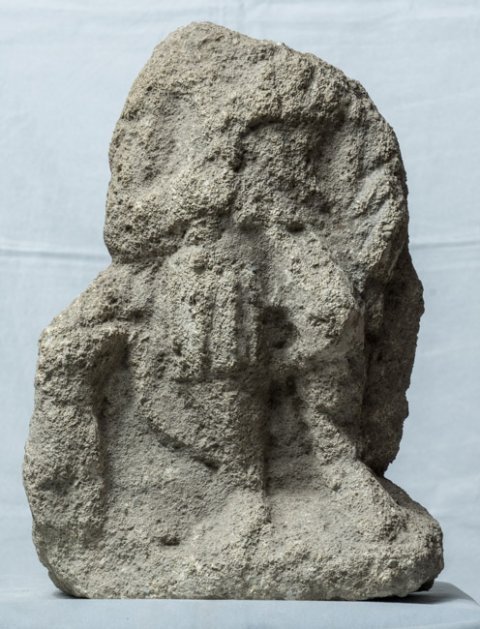- Mythische Figur : Silvanus in kurzer gegürteter Tunica, neben dem rechten Bein sitzender Hund.