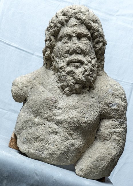 - Mythische Figur (Flussgott): bärtiger Mann mit langen Locken und Vollbart, in gelagerter Haltung auf den linken Arm gestützt.