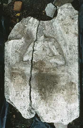 - In Giebelnische Brustbild eines Mannes (Soldat), in den Händen Werkzeug (ascia und Meißel).