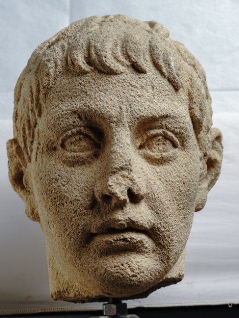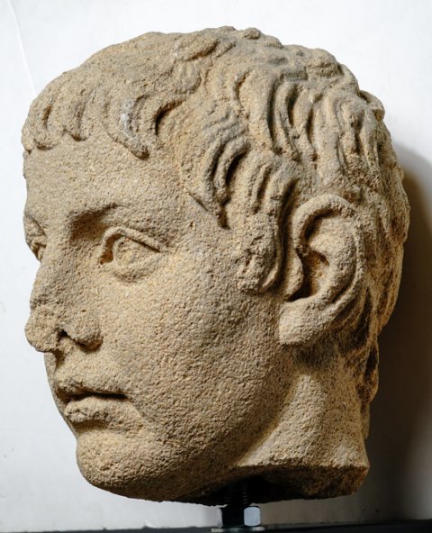- Porträtkopf eines jungen bartlosen Mannes mit in die Stirn gekämmten gewellten Haarsträhnen.