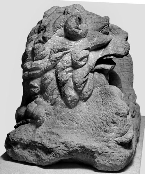 - auf flacher Basisplatte liegender Löwe mit nach links gedrehtem Kopf und Stierkopf in den Pranken