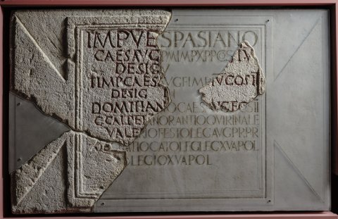 - Imp(eratori) Ve[spasiano] / Caes(ari) Aug(usto) [p(ontifici m(aximo) imp(eratori) X p(atri) p(atriae) co(n)]s(uli) IV / desig(nato) V / T(ito) Imp(eratori) Caes(ari) A[ug(usti) f(ilio) imp(eratori)] IV co(n)s(uli) II / desig(nato) II[I] / Domitiano [C(aes(ari) A]ug(usti) f(ilio) c[o(n)s(uli) II] / C(aio) Calpeta[no Rantio Quirinale] / Valer[io Festo leg(ato) Aug(usti) pr(o) pr(aetore)] / Q(uinto) E[g]na[tio Cato leg(ato) leg(ionis) XV Apollinaris]