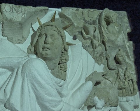 - Mythos : Stiertötung (Tauroktonie), Köpfe von Mithras und Stier, Lunabüste, Cautes