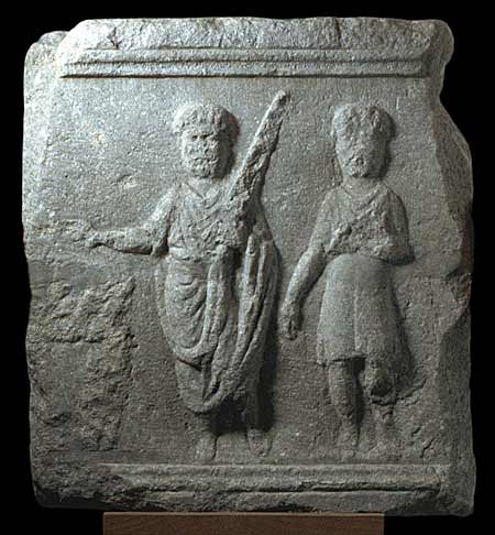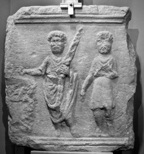 - Rechts Diener: kurze Tunica, Stiefel. Links Lictor: bärtig, Locken,Toga und Ärmeltunica, schultert mit der Linken die fasces (Rutenbündel), die Rechte weist auf die sella curulis.