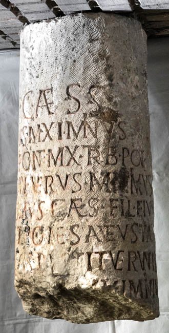 - Imp(erator) Caes(ar) / C(aius) Iul(ius) Verus Maximinus / p(ius) f(elix) Aug(ustus) pont(ifex) max(imus) trib(unicia) pot(estate) / p(ater) p(atriae) et C(aius Iul(ius) Verus / nobilissimus Caes(ar) / vias et pontes ae[?] / conlabsas [---] / AM[---] / [-----]