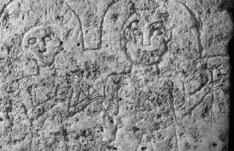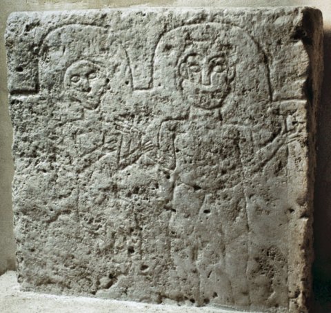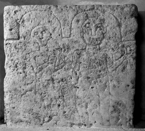 - zwei frontal nebeneinander stehende Figuren (rechts Mann, links Frau ?) unter Doppelbogen. Römisch ?