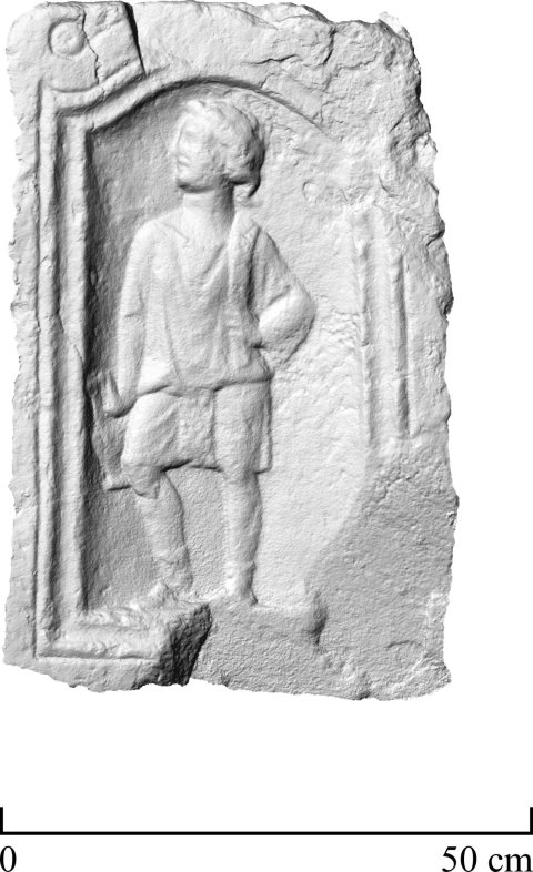 - Diener: in Bogennische Mann in kurzer Tunica, in der Rechten Kanne, über der linken Schulter mappa.