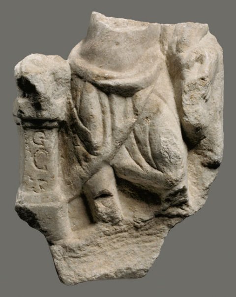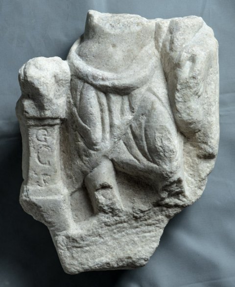 - Mythische Figur (Genius): stehende Figur, Mantel um die Hüften, im linken Arm Füllhorn, neben dem rechten Bein Altar mit Inschrift.