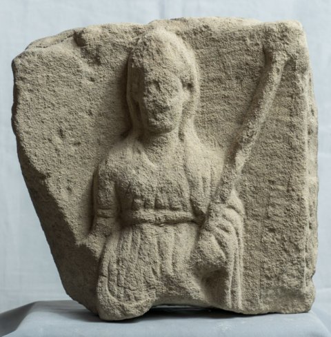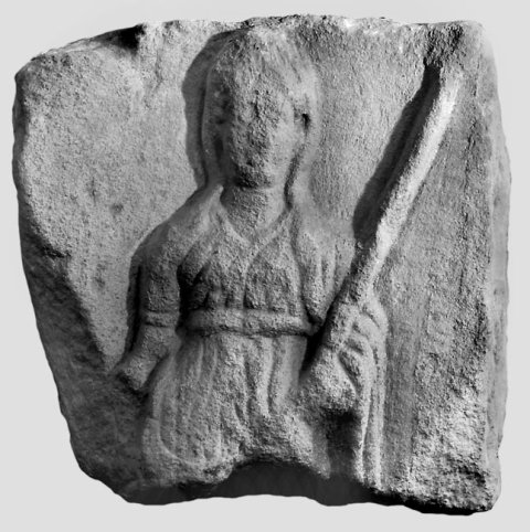 - Mythische Figur (Juno ?): frontal stehende Göttin mit Schleier, hochgegürtetem Chiton, Mantel über der linken Schulter, in der Linken Szepter oder Fackel, um den rechten Oberarm Reif.