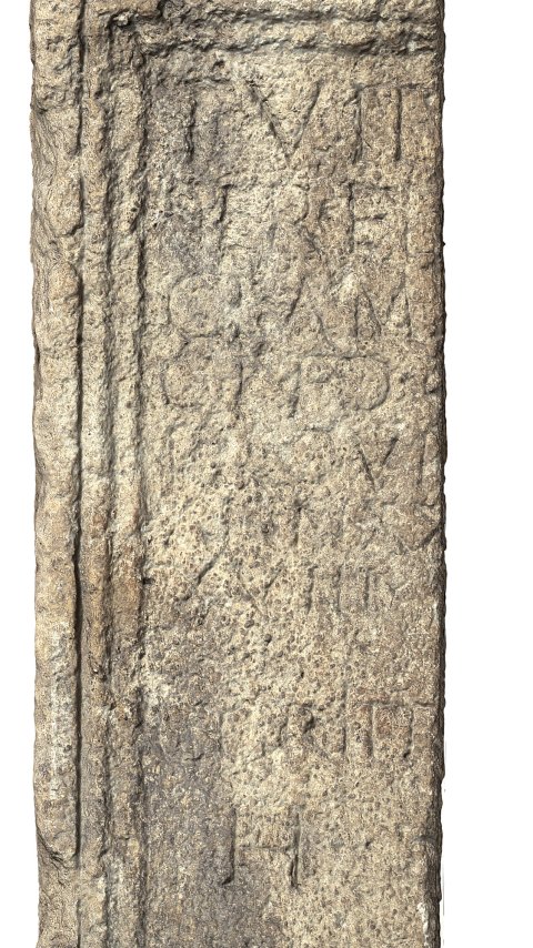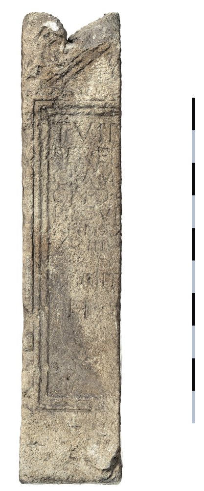 - T(itus) Vite[llius(?)] / Ser(gia) Fe[lix(?) F(oro)] / Cla(udi) m[il(es) leg(ionis) XI] / C(laudiae) P(iae) F(idelis) |(centuria) [---]/pri qui vixit ann(os) XX[--- mil(itavit) ann(os)] / XVIII [h(ic) s(itus) e(st)] / C(aius) Critt[ius ---] / h(eres) [f(aciendum) c(uravit)]