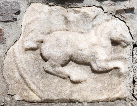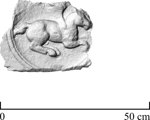 - Auf der Außenseite einer Aedicula-Wand oben: mythische Figur (Pegasus) : Medaillon mit nach rechts galoppierendem Flügelpferd.