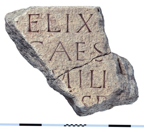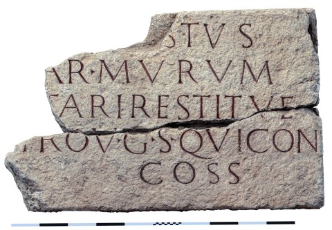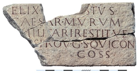 - Pius] Felix [Augu]stus / [nobilissimus] Caesar murum / [--- manu] militari restitue/[runt curante --- prae]s(ide) prov(inciae) G(ermaniae) s(uperioris) qui con/[didit(?) ---] iter(um) co(n)ss(ulibus)
