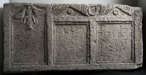 - Drei einfach gerahmte Schriftfelder nebeneinander, mittleres und rechtes mit Giebel mit Rosette. Zwischen den Giebeln Mondsichel. Über dem linken Feld zweihenkeliges Gefäß, flankiert von zwei Tauben, die an einer herabhängenden Weintraube picken. Inschrift nur im rechten Feld ausgeführt.