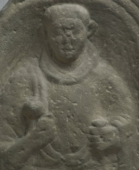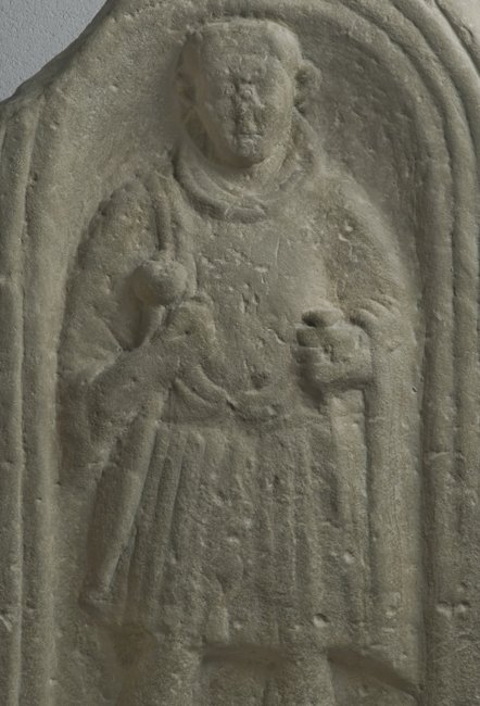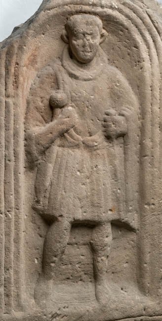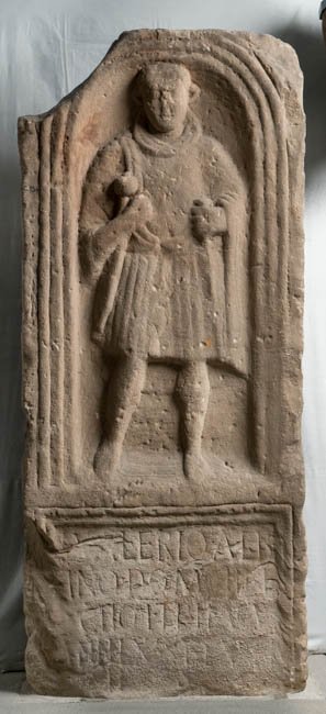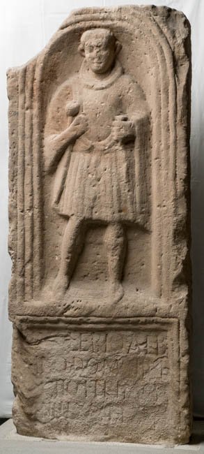 - In profiliert gerahmter Rundbogennische stehender Mann (Soldat) mit Mantel , kurzer Ärmeltunica mit Gürtel, in der Rechten Stock (vitis), in der Linken Dolch (?). Schriftfeld gerahmt;