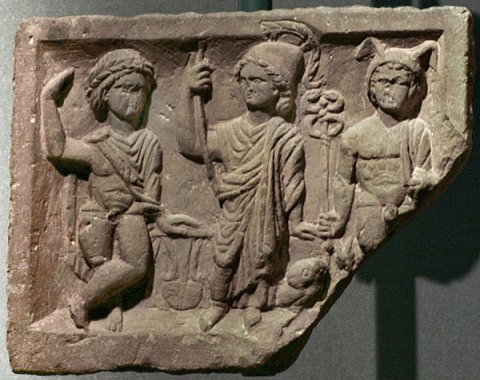 - Mythische Figuren, Musikinstrument: links Apollon, mit überkreuzten Beinen, die Linke auf die Lyra gestützt, die Rechte erhoben, im Haar Lorbeerkranz. In der Mitte Minerva mit Helm, Chiton und Mantel, in der Rechten Lanze, die Linke auf dem Schildrand, neben dem linken Fuß Eule. Rechts Mercur mit Flügelkappe, in der Rechten Caduceus.