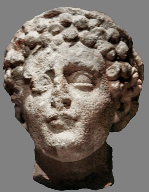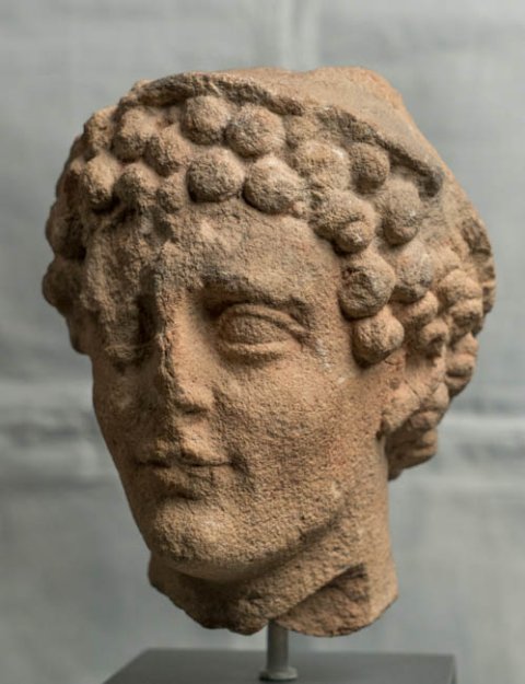 - Mythische Figur: Kopf einer lebensgroßen Mercur-Statue mit Flügelkappe und Buckellockenfrisur.